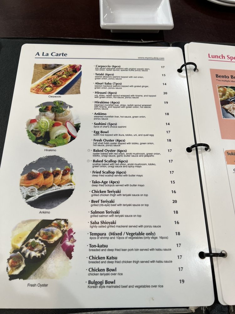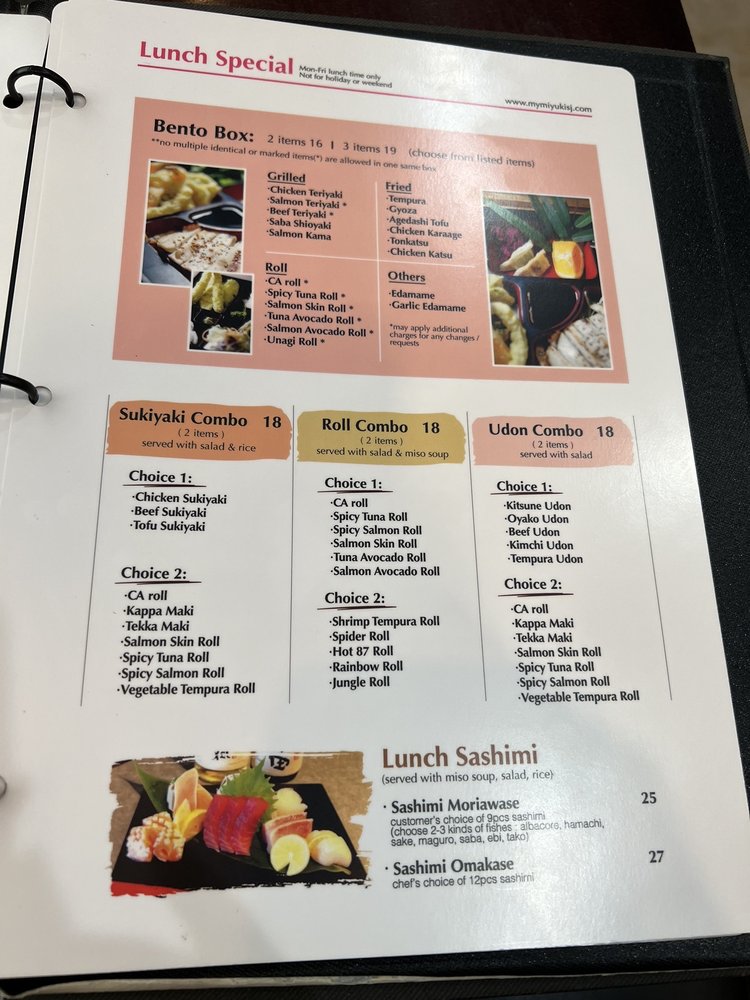 Located in San Jose, CA, Miyuki Japanese Restaurant offers a wide range of Japanese cuisine, including sushi, bento plates, and finger foods. With a casual and welcoming ambiance, this restaurant provides excellent service and a variety of menu options suitable for any palate. Customers have raved about the beautifully presented dishes, such as the Lion King, California Rolls, and Beef Teriyaki. The menu also includes favorites like Hamachi Nigiri, Tempura Udon, and Salmon Teriyaki Teishoku. The fresh and flavorful sushi rolls, like the Sunset Roll and Orange Lady Roll, are not only delicious but also visually stunning. The friendly staff and accommodating service add to the overall dining experience. Don't miss out on the vegetable tempura and miso soup for a truly authentic taste of Japanese cuisine. Miyuki Japanese Restaurant is the perfect spot for a relaxing lunch or dinner with a menu that caters to all preferences.